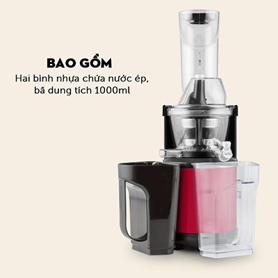 - Máy trang bị 2 bình đựng nước ép và bã, dung tích lên đến 1 lít mỗi bình. Chất liệu cao cấp, độ bền cao, an toàn sức khỏe người dùng.