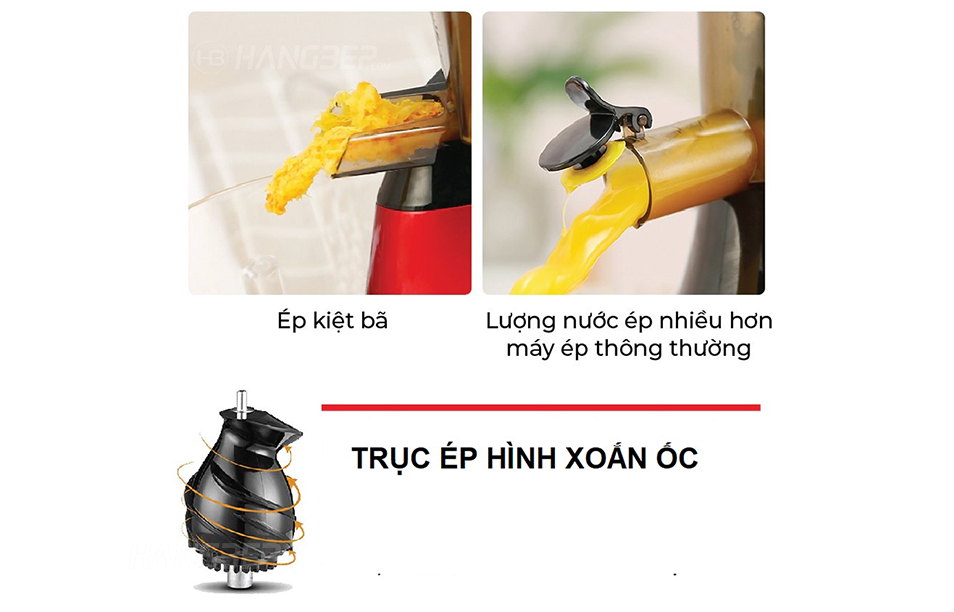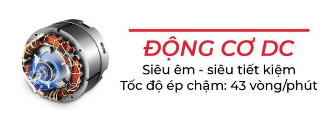 Công nghệ ép chậm 43vòng/phút với trục ép hình xoắn ốc ép kiệt nước thu được lượng nước ép nhiều hơn các loại máy ép thông thường.
