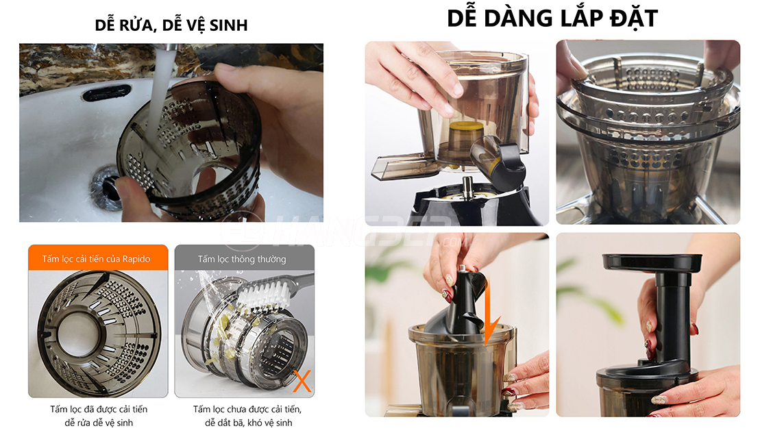 Lưới lọc bác cải tiến của Rapido giúp bã nguyên liệu không bị kẹt dính vào trong lưới lọc. Điều này không những giúp vệ sinh dễ dàng hơn mà còn giúp tách biệt bã và nước khi ép. Đem đến cho bạn ly nước ép hấp dẫn mà trẻ nhỏ cũng có thể sử dụng được.