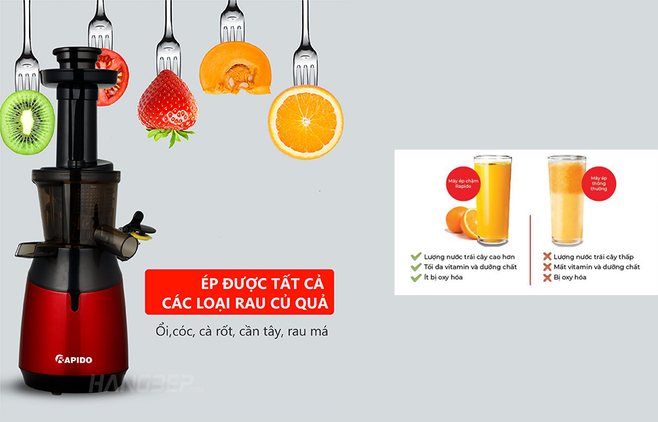 Với máy ép thông thường chỉ sau 15 phút nước ép đã bắt đầu tách nước, đổi màu do bị oxi hóa. Còn với máy ép chậm Rapido, vì được ép bằng công nghệ ép chậm tiên tiến của Đức nên luôn giữ được hương vị tươi ngon, đảm bảo giữ được tới 98% lượng dưỡng chất có sẵn trong hoa quả.