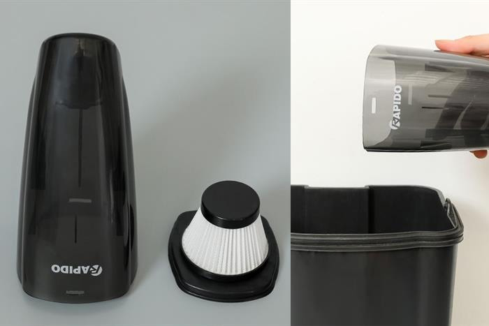 Ngăn chứa bụi 800ml có thể tháo rời để đổ bụi bẩn, vật hút được ra ngoài và rửa sạch sau khi hút bụi. Kèm theo là bộ lọc HEPA lọc sạch bụi bẩn. Lưu ý nên thay bộ lọc định kỳ để máy đạt hiệu suất hút tốt nhất.