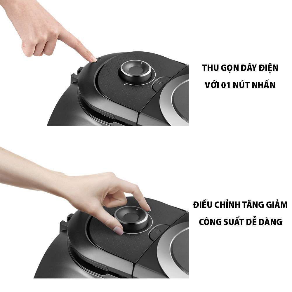 Để điều chỉnh tăng giảm lực hút và mức độ làm sạch khác nhau, chỉ cần xoay theo các mức. Sau khi sử dụng máy hút bụi, chỉ cần nhấn nút là dây điện sẽ tự động thu gọn.