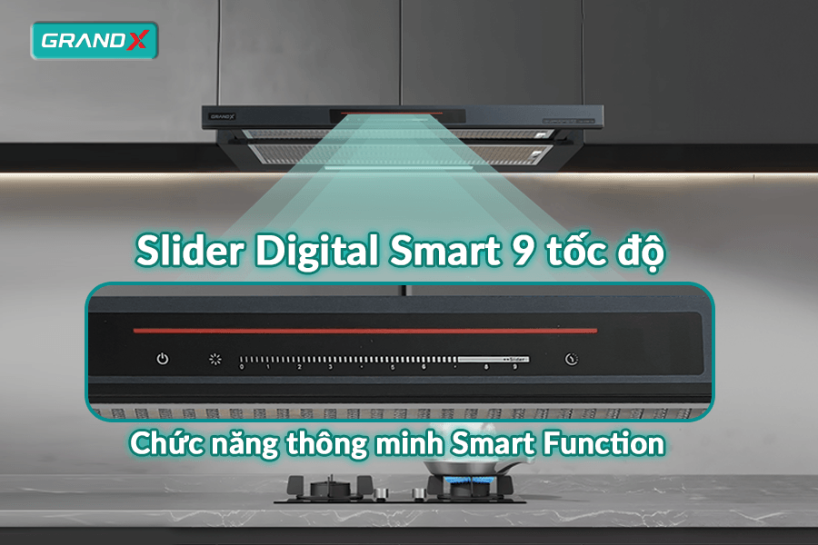 Bảng điều khiển cảm ứng Slider Digital Smart với 9 mức tốc độ hút và 1 chế độ Supper Booster mạnh mẽ khi cần xử lý nhanh lượng khói và mùi lớn.