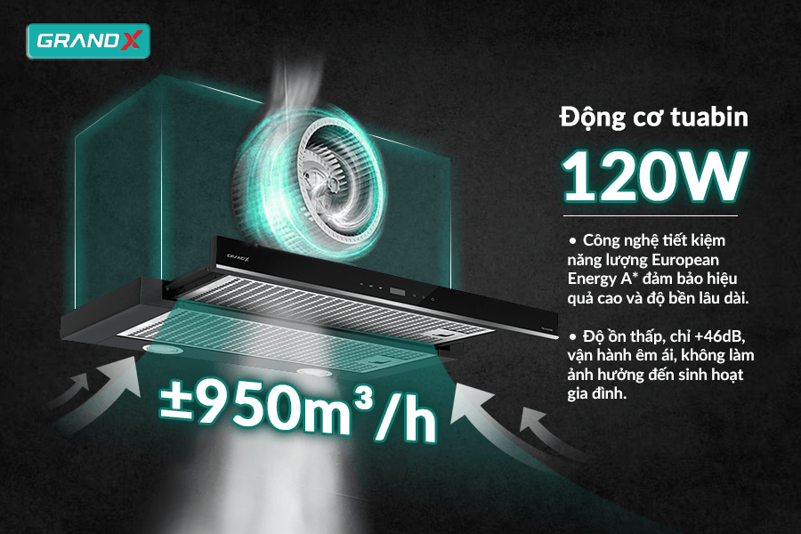 Sở hữu động cơ tua-bin cao cấp 120W cùng công nghệ tiết kiệm năng lượng European Energy A, máy hút mùi sẽ nhanh chóng đánh bay mùi khó chịu trong gian bếp, đảm bảo không gian nấu nướng thoải mái cho người sử dụng.