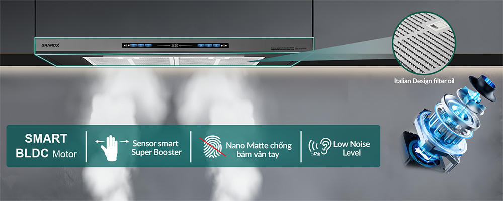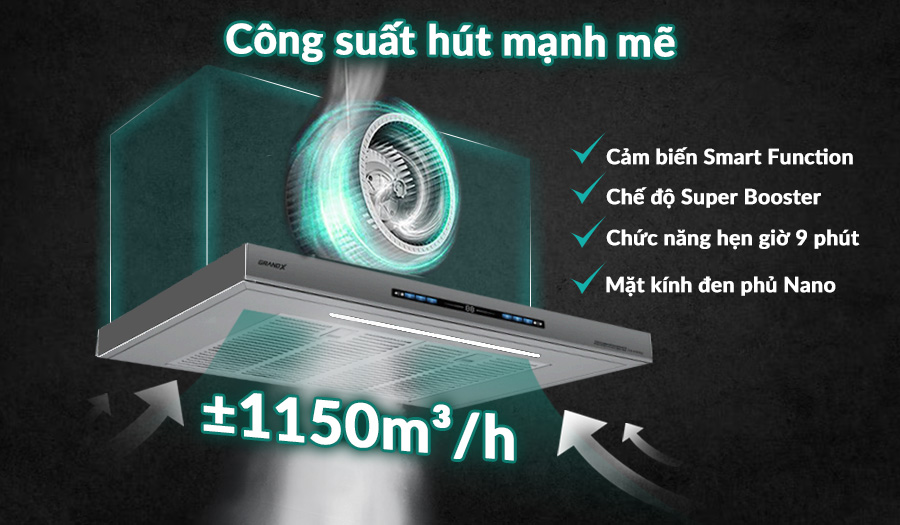 Lực hút mạnh lên đến 1150m³/giờ giúp loại bỏ nhanh chóng khói, mùi và hơi dầu mỡ trong quá trình nấu nướng. Ngoài ra bạn có thể chọn chế độ Super Booster để tăng tốc hút cực đại khi cần thiết.