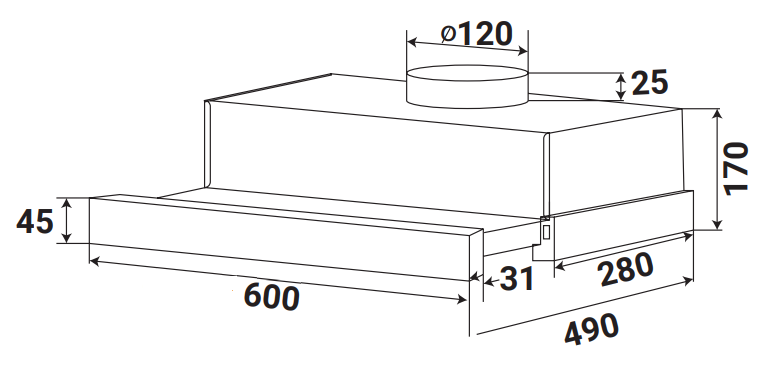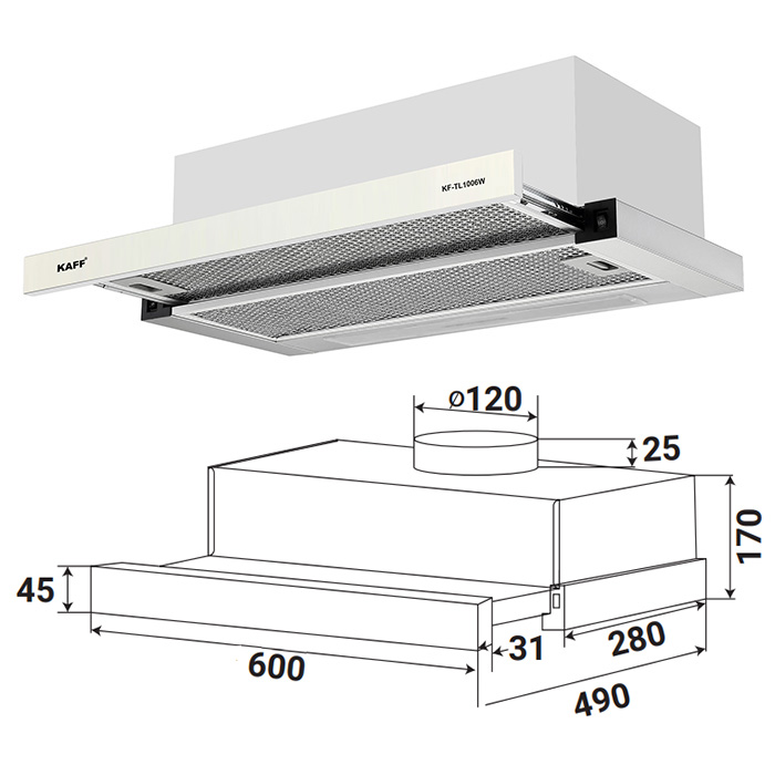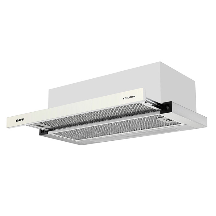 Máy hút mùi âm tủ Kaff KF-TL1006W dạng lắp âm tủ với kích thước 600x280x170mm (kích thước khi kéo ra 600x490x170mm), phù hợp cho không gian bếp nhỏ, hoặc muốn sử dụng không gian phía trên máy làm tủ bếp. Vỏ máy thép phủ sơn tĩnh điện chống gỉ tạo độ bền cao cho máy, toát lên vẻ ngoài sang trọng. Chất liệu này còn có ưu điểm dễ lau chùi, chống bám dầu mỡ và oxy hóa hiệu quả. Thiết bị luôn giữ được vẻ sáng bóng như mới dù sử dụng lâu dài.