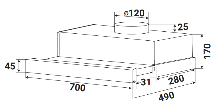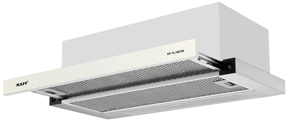 Máy hút mùi âm tủ Kaff KF-TL1007W dạng lắp âm tủ với kích thước 700x280x170mm (kích thước khi kéo ra 700x490x170mm), phù hợp cho không gian bếp nhỏ, hoặc muốn sử dụng không gian phía trên máy làm tủ bếp. Vỏ máy thép phủ sơn tĩnh điện chống gỉ tạo độ bền cao cho máy, toát lên vẻ ngoài sang trọng. Chất liệu này còn có ưu điểm dễ lau chùi, chống bám dầu mỡ và oxy hóa hiệu quả. Thiết bị luôn giữ được vẻ sáng bóng như mới dù sử dụng lâu dài.