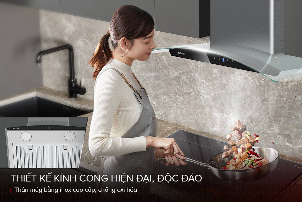 Máy hút mùi Mutlich sở hữu kính cong độc đáo, thân máy làm bằng inox cao cấp sáng bóng chắc chắn nhưng không kém phần sang trọng. Chất liệu inox giúp dễ dàng vệ sinh sau mỗi lần dùng cũng như cho sản phẩm luôn mới theo thời gian