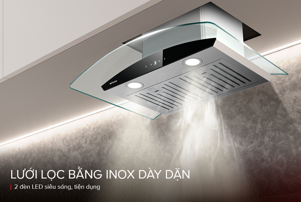 Hệ thống lưới lọc cũng bằng Inox dễ dàng lấy ra chùi rửa định kỳ giúp ngăn chặn dầu mỡ văng vào bên trong,giúp tăng tuổi thọ linh kiện của máy. Phía dưới hãng bố trí 2 đèn lED công suất 3W đủ chiếu sáng trong mọi điều kiện khi nấu nướng