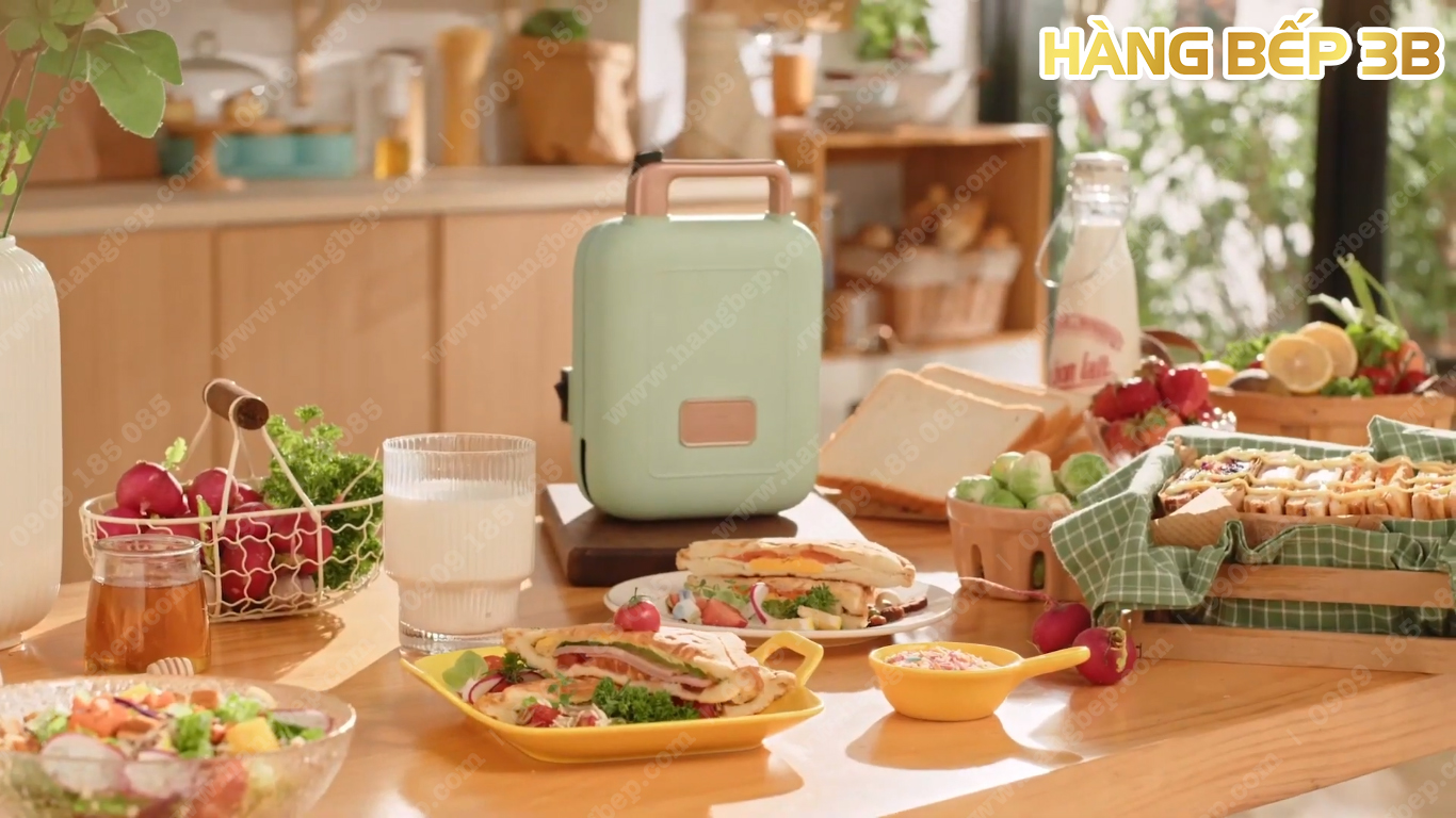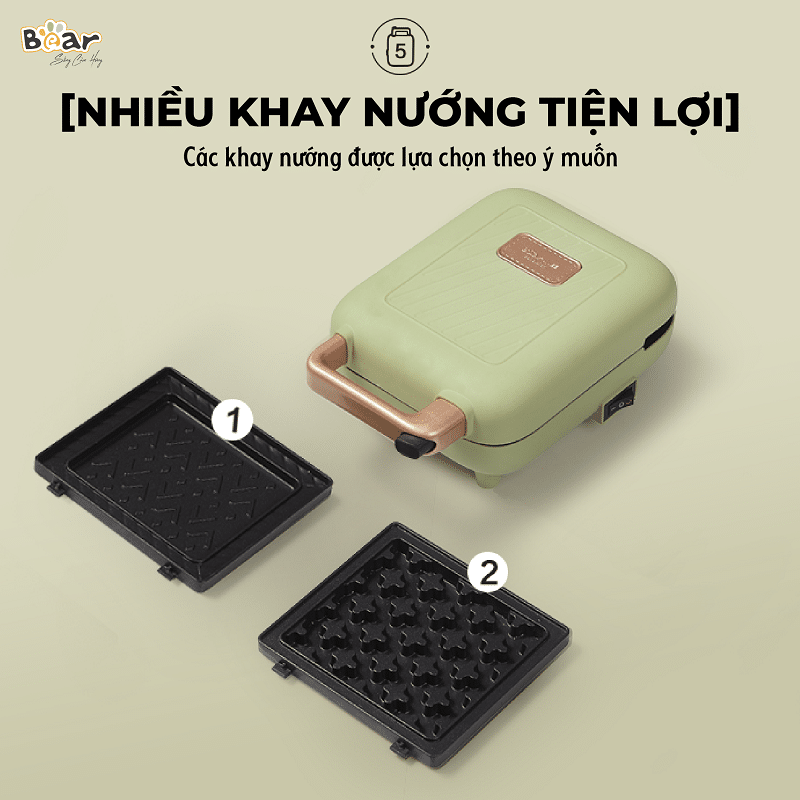 Máy có 2 loại khay nướng (mỗi loại 2 cái), bạn có thể nướng bánh hotdog, sandwich, waffle ; chiên xúc xích, thịt xông khói, ham, trứng,...