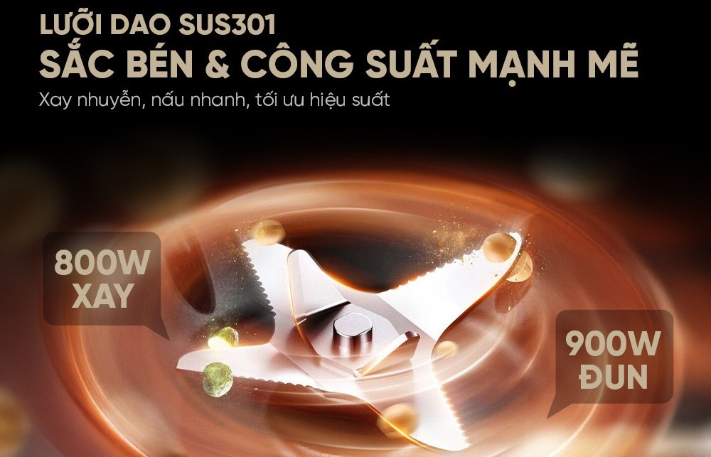 Công suất xay là 800W và công suất nấu là 900W rút ngắn thời gian xay nấu nhanh hơn và mạnh hơn.