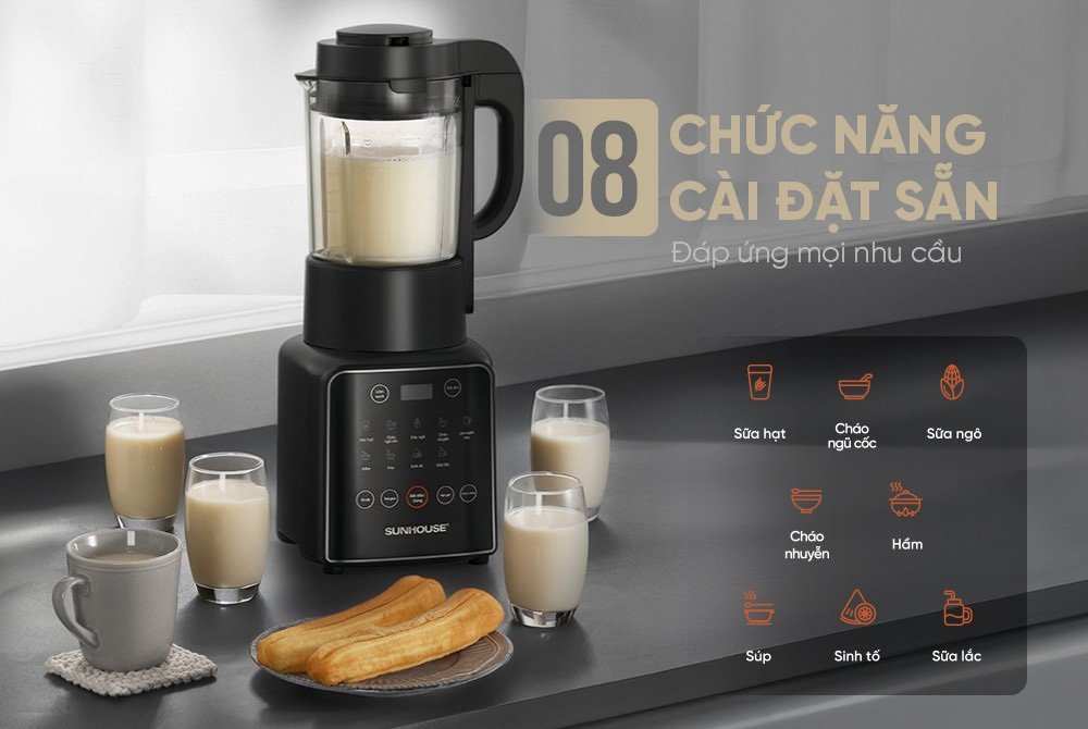 Chức năng nấu | Nấu sữa hạt Nấu sữa bắp Nấu cháo ngũ cốc Nấu cháo nhuyễn Nấu súp Làm món hầm Làm sữa lắc Làm sinh tố |