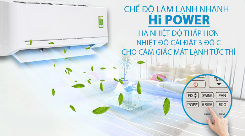 Khi tính năng này Hi POWER được bật thì máy sẽ hoạt động với công suất lớn để nhiệt độ nhỏ hơn nhiệt độ cài đặt đến 3 độ C, đồng thời Toshiba đã thiết kế thay đổi kích thước ống đồng dẫn nhiệt trong máy lạnh nhỏ lại, điều này sẽ giúp tăng diện tích để quấn ống đồng, lá nhôm nhiều hơn, bề mặt tiếp xúc lớn sẽ cho quá trình trao đổi nhiệt nhanh hơn, sẽ cho cảm giác mát lạnh thoải mái dễ chịu hơn.