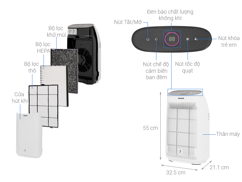 Với bộ lọc Hepa, máy lọc được bụi mịn PM 2.5 đến 99,5%. Đồng thời lọc 99% vi khuẩn và 99,9% virus để luôn mang đến bầu không khí có lợi cho sức khỏe cho gia đình bạn