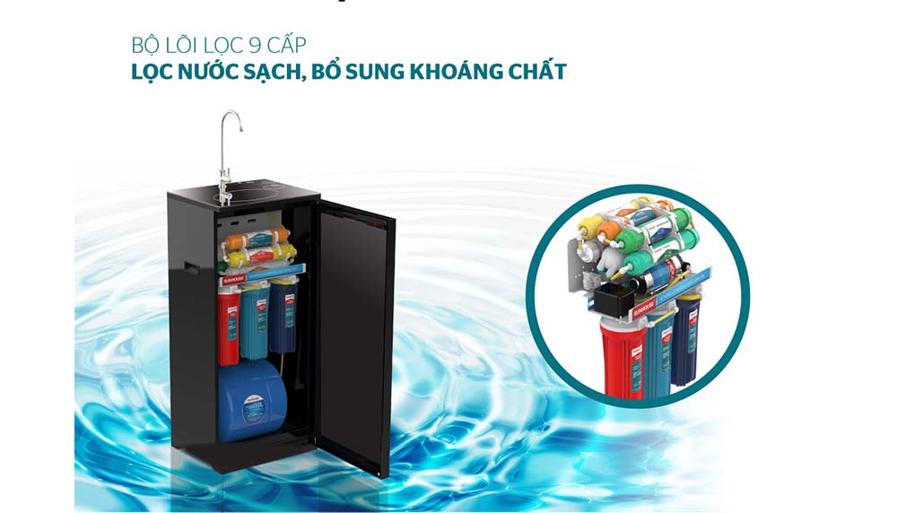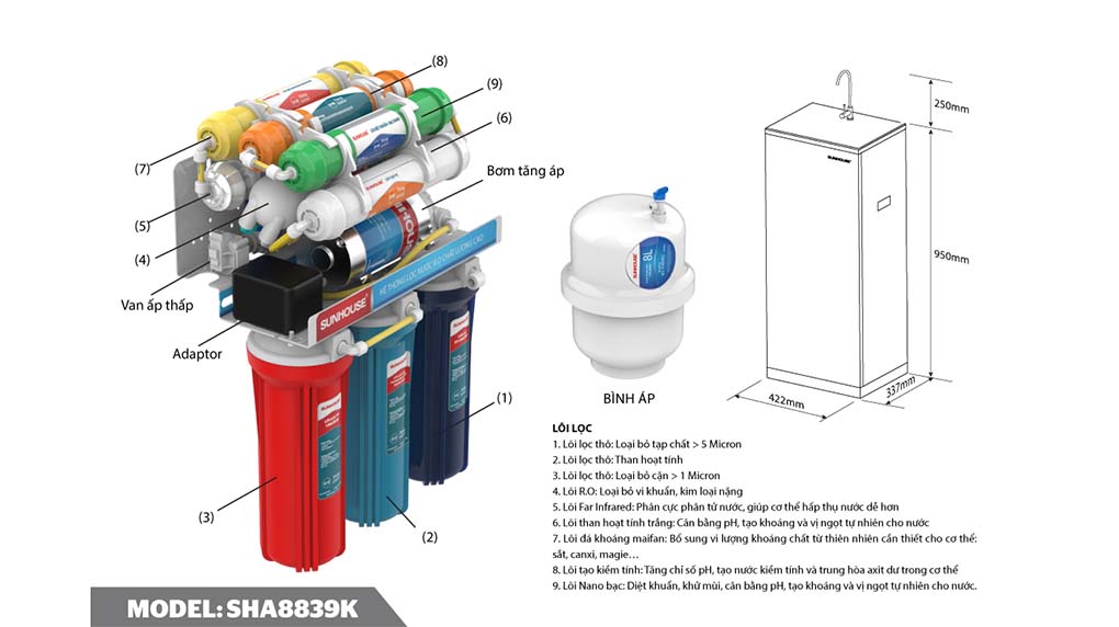 Máy lọc nước RO Sunhouse SHA8839K trang bị 9 cấp lọc giúp loại bỏ hòa toàn vi khuẩn, kim loại nặng trong nước giúp gia đình yên tâm nấu nướng cũng như uống trực tiếp vào người