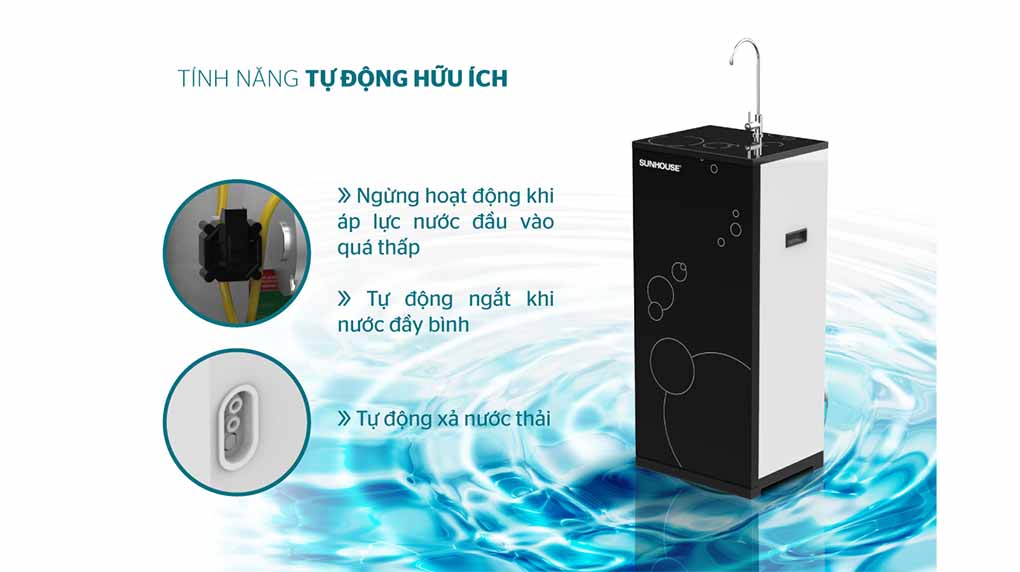 Máy lọc nước R.O SUNHOUSE SHA8839K được trang bị nhiều tính năng tự động hiện đại như: ngừng hoạt động khi áp lực nước đầu vào quá thấp, tự động ngắt khi nước đầy bình và tự động xả nước thải.