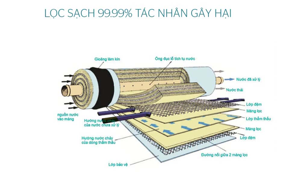 Máy trang bị bộ lọc 9 cấp có van điện từ và hệ thống tự động kiểm soát hoạt động hiện đại cùng với công nghệ diệt khuẩn tiên tiến hàng đầu NANO SILVER và màng R.O nhập khẩu Hàn Quốc.