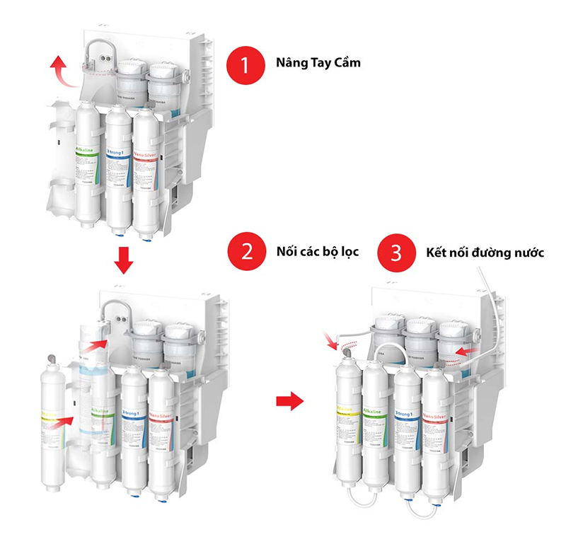 Với công nghệ thiết lập kết nối nhanh chóng, 3 bước để thiết lập với bộ lọc: Nâng tay cầm → Nối các bộ lọc → Kết nối đường nước.