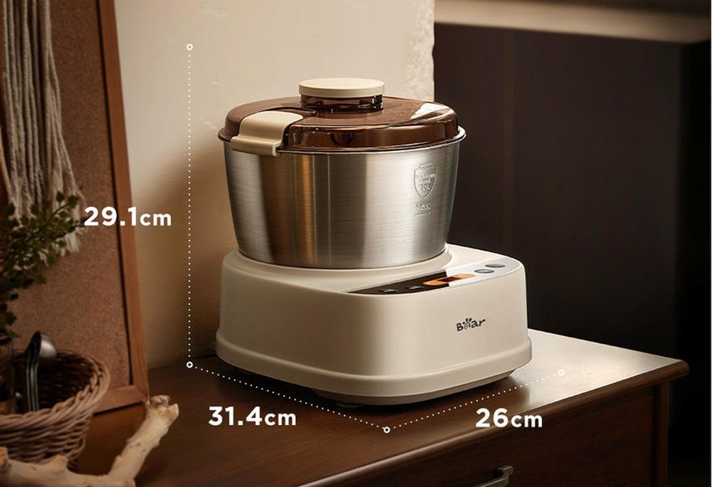 Cối trộn inox 304 với dung tích 5 lít, Bear SM-5H50Z68 có thể xử lý từ 400g đến 1.6kg bột khô, cho ra thành phẩm khoảng 2.5kg bột đã trộn. Với dung tích này sẽ phù hợp sử dụng tại nhà, tiệm bánh nhỏ,...