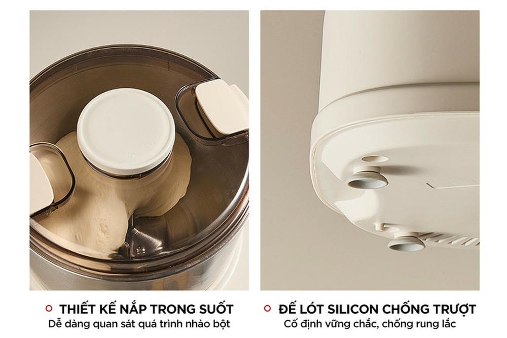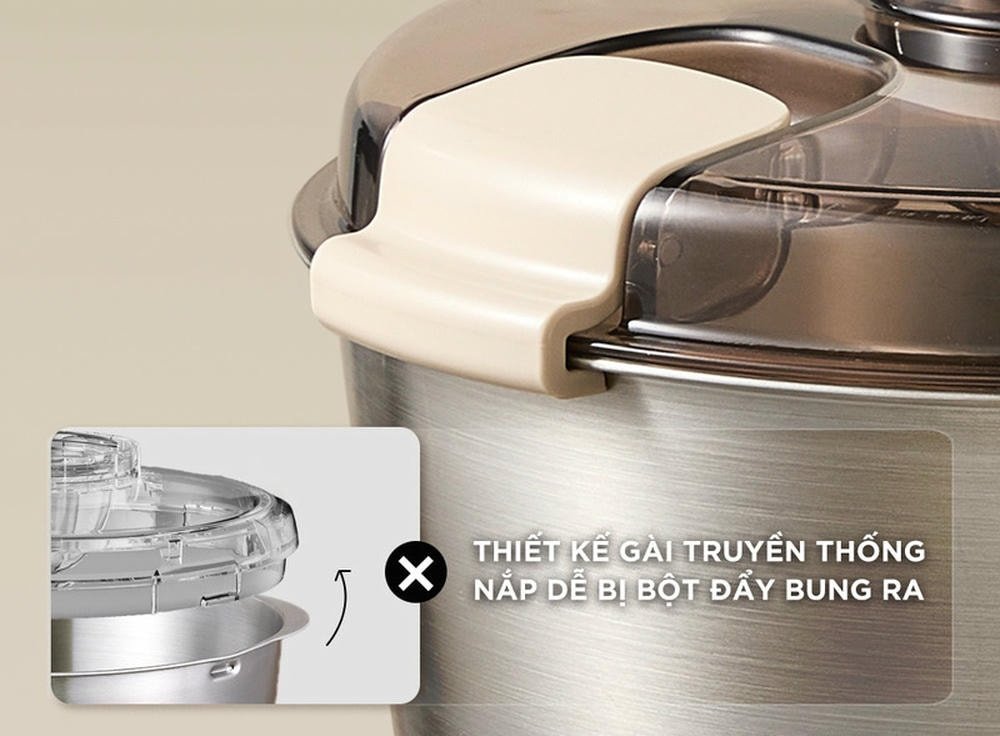 Nắp khóa gài dễ dàng được đóng mở, khi khóa được gài lại chắc chắn sẽ hạn chế tình trạng bột đẩy bung nắp ra. Ngoài ra, với chân đế chống trượt sẽ giúp máy cố định hơn trên mặt phẳng khi đang nhào bột.