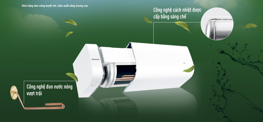 Máy nước nóng gián tiếp Panasonic này ứng dụng công nghệ cách nhiệt được cấp bằng sáng chế. Lớp cách nhiệt dùng vật liệu xốp Styrofoam với tỉ trọng cao cho hiệu quả giữ nhiệt tốt cùng với công nghệ đun nước nóng qua thanh nhiệt bằng đồng giúp làm nóng nước trong thời gian ngắn, tiết kiệm điện năng.