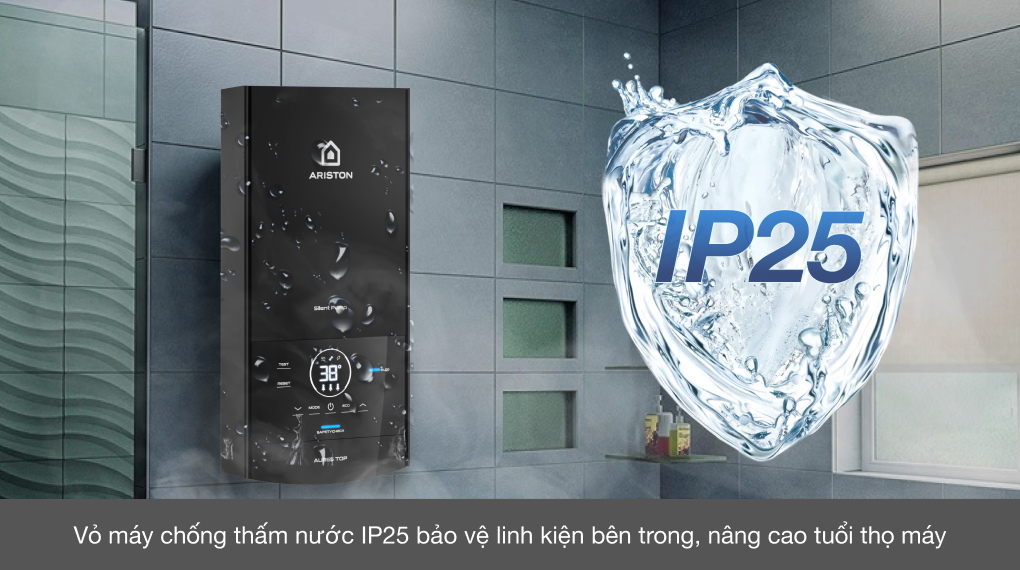 - Máy nước nóng trực tiếp Ariston có chuẩn chống nước IP25 bảo đảm an toàn cho các linh kiện bên trong, hạn chế sự bắn phá của các tia nước gây chập mạch, vỏ máy nhẵn bóng dễ dàng lau chùi, vệ sinh giúp nâng cao độ bền mới và tuổi thọ cho sản phẩm.