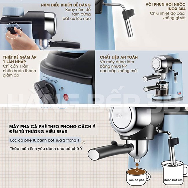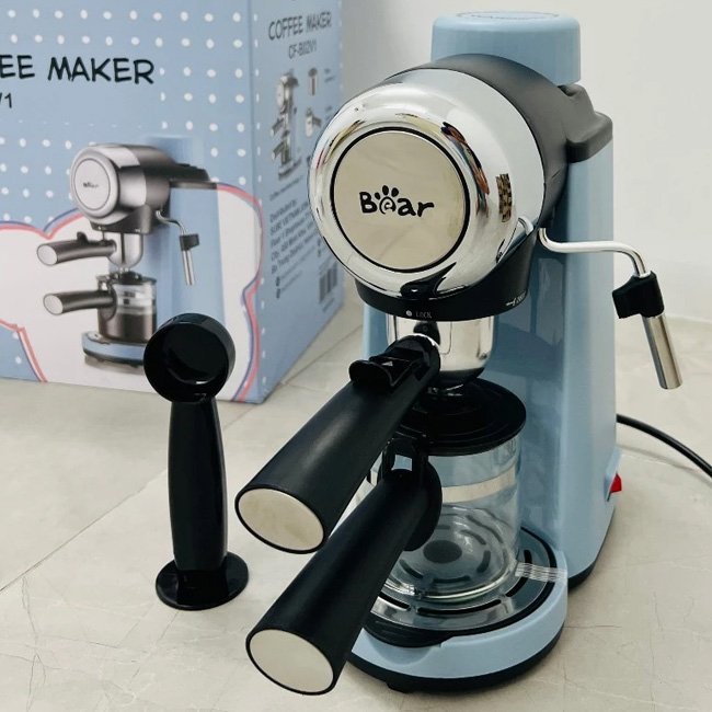 Máy pha cà phê Bear CF-B02V1 với thiết kế nhỏ gọn và màu sắc nhẹ nhàng, không tốn quá nhiều diện tích đặt để. Đây là dòng máy pha cà phê bán tự động, có thể pha ra cafe espresso chuẩn hương vị Ý với chỉ 15 giây.
