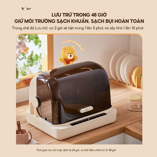 Khi lựa chọn chế độ "Lưu trữ", thời gian mặc định sẽ là 24 tiếng (cứ 2 tiếng sẽ tiệt trùng và sấy khô 1 lần), nếu bạn muốn lưu trữ 48 tiếng thì cài đặt khi cần nhé.
