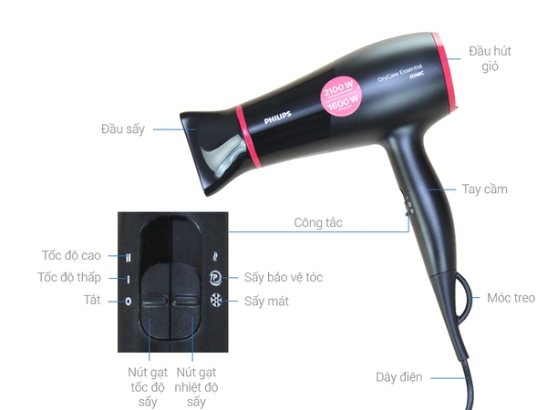 Công suất 1600 W mạnh mẽ sấy tóc mau khô, với chế độ sấy bảo vệ không làm hư tóc