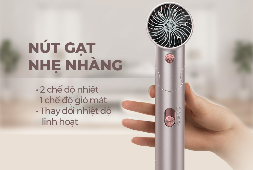 Sản phẩm sử dụng nút gạt lên xuống để điều chỉnh tốc độ gió và mức nhiệt theo nhu cầu sử dụng. Chế độ gió nóng mặc định, nếu muốn đổi chế độ gió mát, bạn chỉ cần gạt nút có sẵn trên tay cầm.