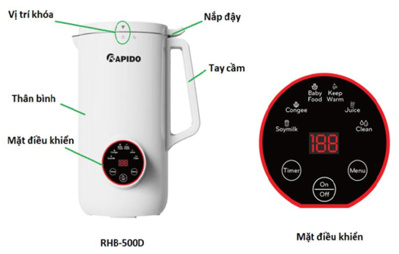 | Chức năng cài đặt sẵn | Nấu sữa đậu nành (Soy milk) Nấu cháo, súp (Congee) Nấu thức ăn dặm (Baby food) Làm sinh tố (Juice) Chức năng giữ ấm (Keep warm) Chức năng vệ sinh (Clean) |