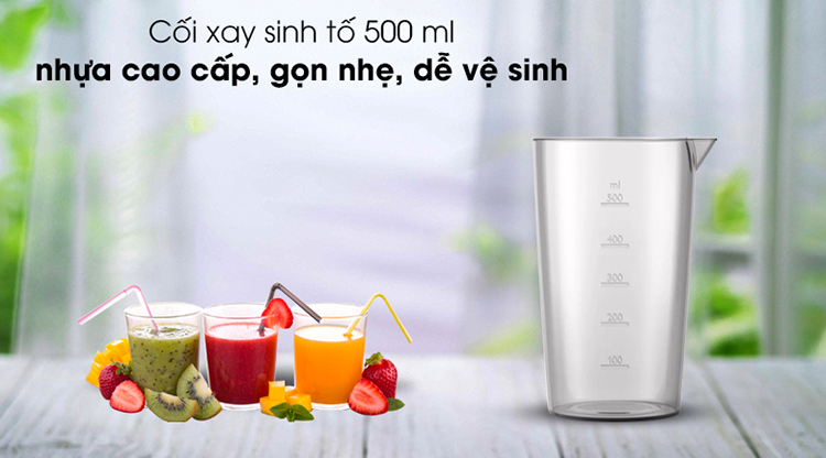 Cốc đựng dung tích sử dụng 500 ml (dung tích trên cối 650 ml) bằng nhựa tốt, kháng vỡ, an toàn cho sức khỏe, dễ chùi rửa
