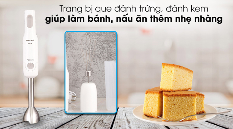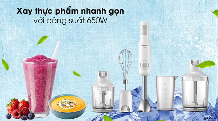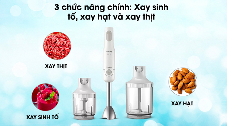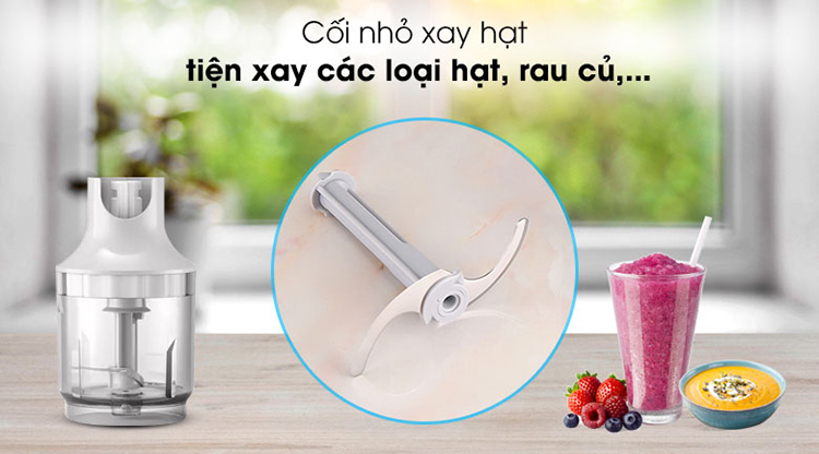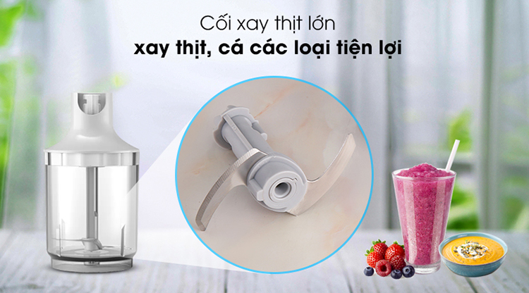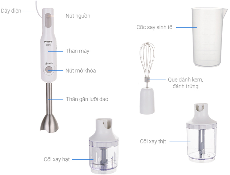 Đi kèm thân máy có thân gắn lưỡi dao, cốc xay sinh tố, que đánh trứng - kem, cối xay thịt, cối xay hạt cho bạn dễ dàng chuẩn bị bữa ăn ngon cho gia đình.