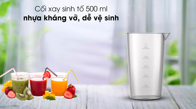 Máy xay sinh tố Philips có cốc xay sinh tố dung tích 650 ml (dùng thực tế 500 ml) bằng nhựa kháng vỡ, an toàn và dễ vệ sinh.