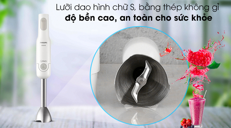 Mát xay sinh tố có tốc độ xay mạnh mẽ với công suất 650W, lưỡi dao bằng thép không gỉ cực bén giúp xay nhanh, bảo vệ lưỡi dao chống văng thức ăn ra ngoài với công nghệ xay ProMix, đầu xay đặc biệt dạng tam giác gợn sóng.