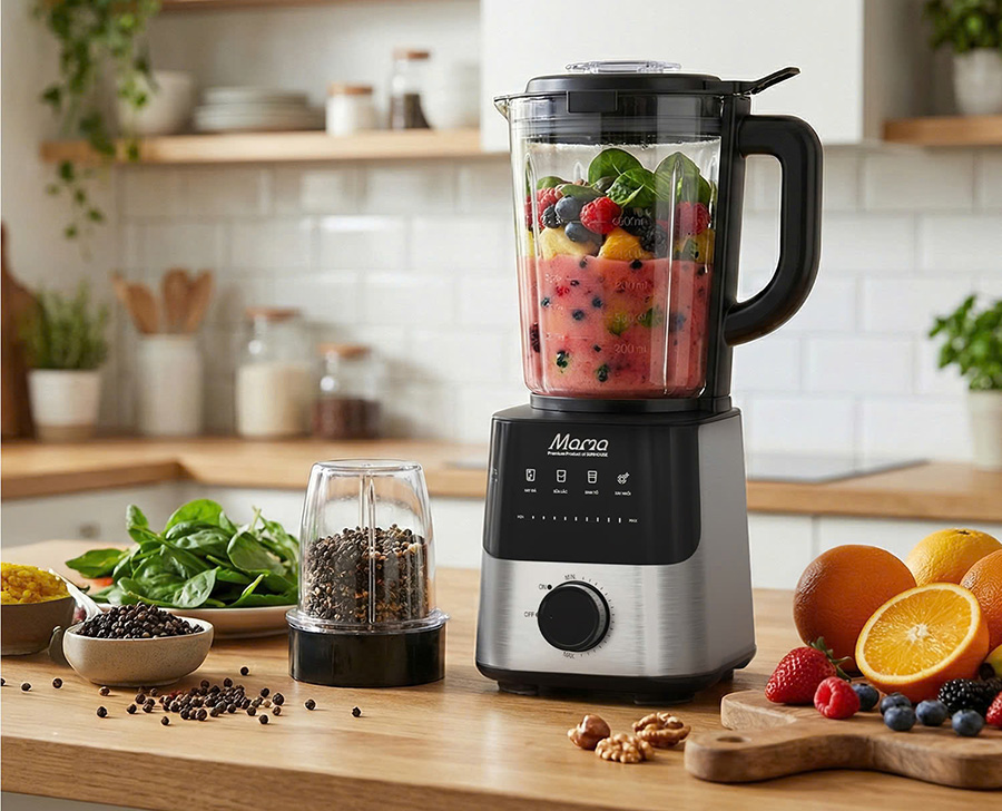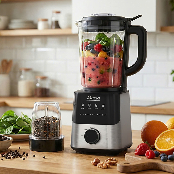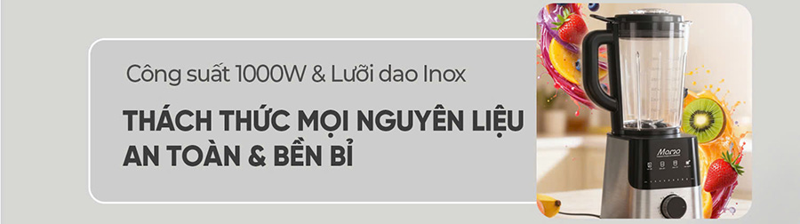 Máy sở hữu công suất đến 1000W, mang lại khả năng xay mạnh mẽ, giúp nguyên liệu được xử lý nhanh và đều. Lưỡi dao làm từ inox 304 bền bỉ, sắc bén, hỗ trợ xay nhuyễn hiệu quả và đảm bảo an toàn cho sức khỏe trong suốt quá trình sử dụng lâu dài.
