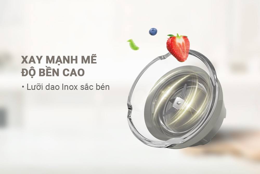 Lưỡi dao của máy được làm từ chất liệu inox cao cấp, được thiết kế riêng biệt để xay nhuyễn các loại nguyên liệu khác nhau không chỉ sắc bén mà còn bền bỉ, giúp xay nhuyễn mọi loại thực phẩm một cách nhanh chóng và hiệu quả.