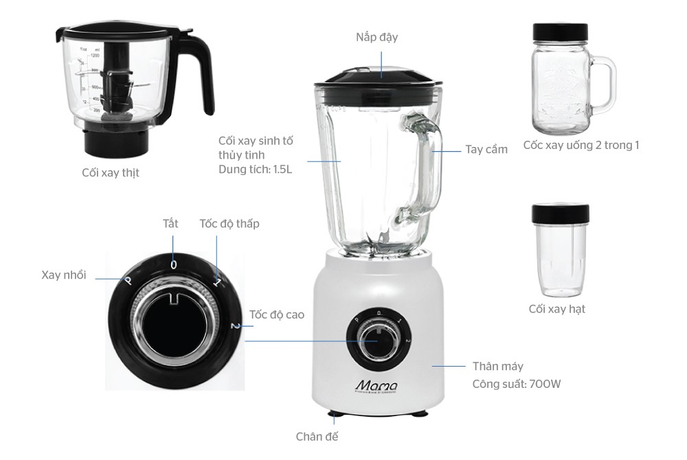 Cối xay sinh tố dung tích 1.5 lít với phần thân làm bằng chất liệu thủy tinh cao cấp, chịu nhiệt tốt, an toàn cho sức khỏe.