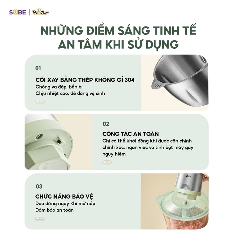 Máy thiết kế nhỏ gọn, khi sử dụng cũng đơn giản. Bạn chỉ cần cho thực phẩm vào cối, lắp lưỡi dao, đặt vào máy và nhấn nút trên thân máy để xay. Tùy vào từng nguyên liệu, bạn có thể chọn mức 1 hoặc mức 2.