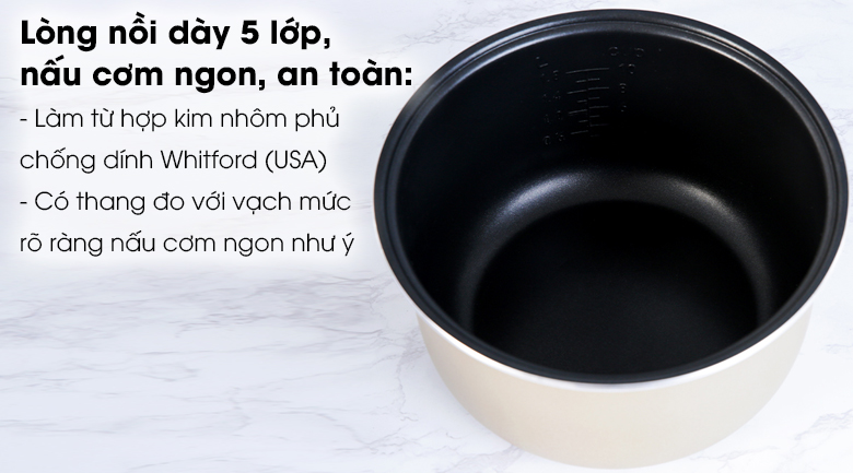Bên trong lòng nồi có thang đo với các vạch mức rõ ràng giúp bạn tính toán và nấu đúng lượng gạo và lượng nước cho cơm chín ngon, đúng ý.