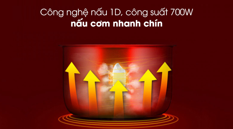 Công nghệ nấu 1D, công suất 700W truyền nhiệt nhanh chóng, cho nồi nấu cơm chín trong 20 - 30 phút, tiết kiệm thời gian
