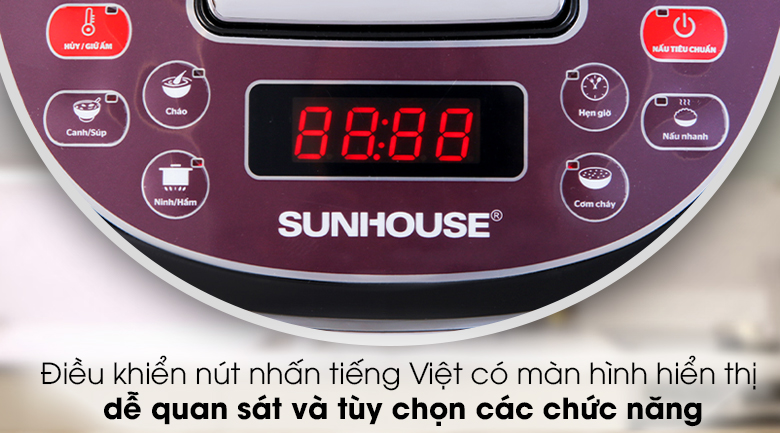 Nồi cơm điện tử Sunhouse có vỏ ngoài nồi được làm bằng nhựa cao cấp siêu bền, cách nhiệt tốt, phối màu mận chín độc đáo