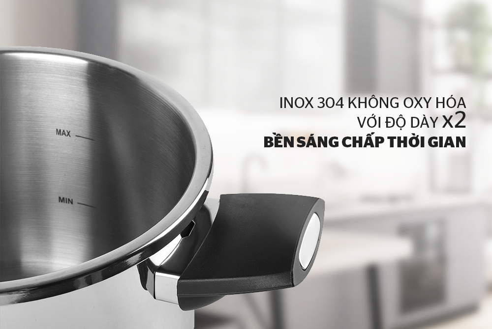 Chất liệu inox không oxy hóa với độ dày gấp 2 lần giúp hạn chế móp méo khi va đập, dễ dàng vệ sinh sau khi nấu và an toàn khi đun nấu với áp suất cao đồng thời duy trì sự sáng bóng khi sử dụng trong thời gian lâu dài.