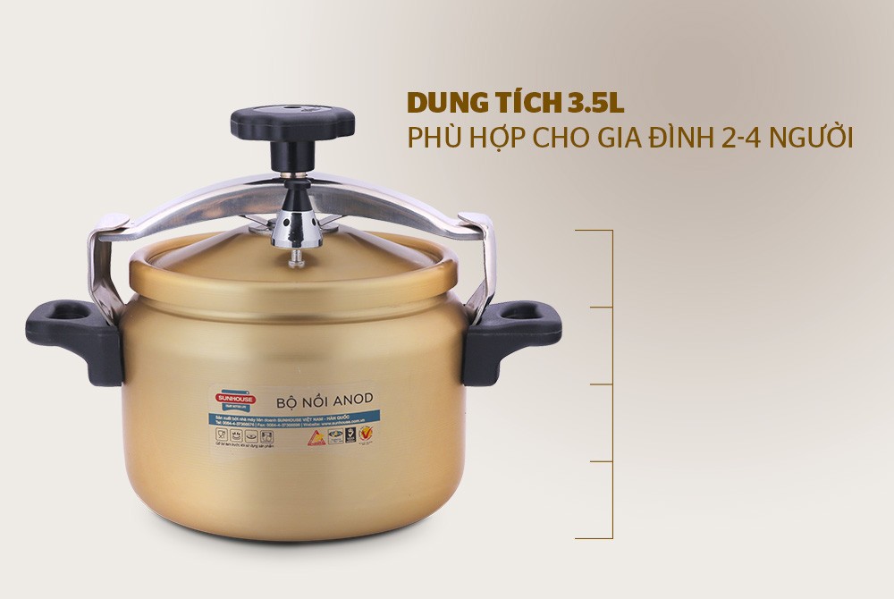 Nồi áp suất Anod Sunhouse SHA8354 có dung tích 3.5 lít, phù hợp cho gia đình 2-4 người. Bạn sẽ dễ dàng chế biến các món ăn như: luộc gà, ninh xương, nấu cháo, canh, súp,...