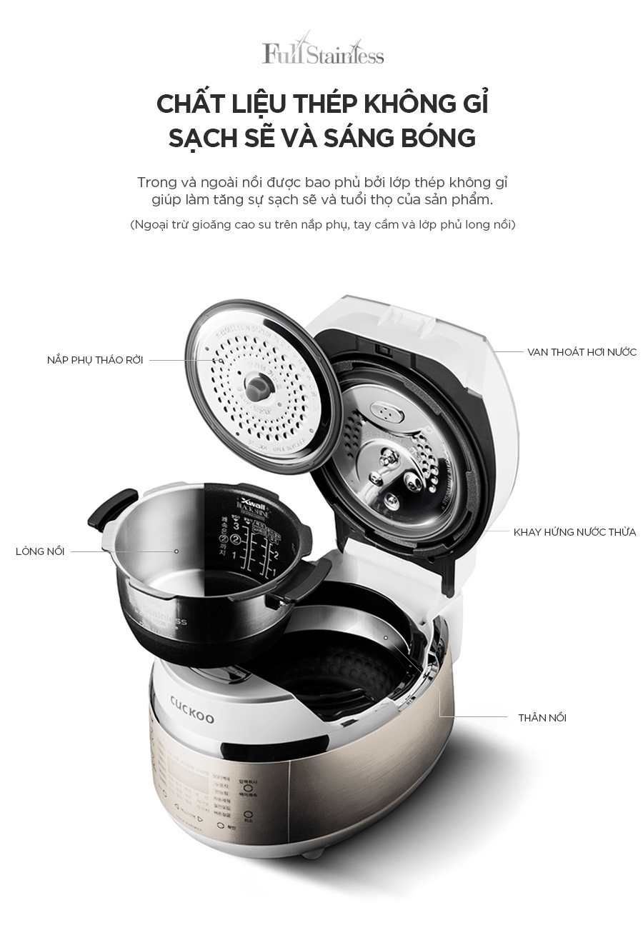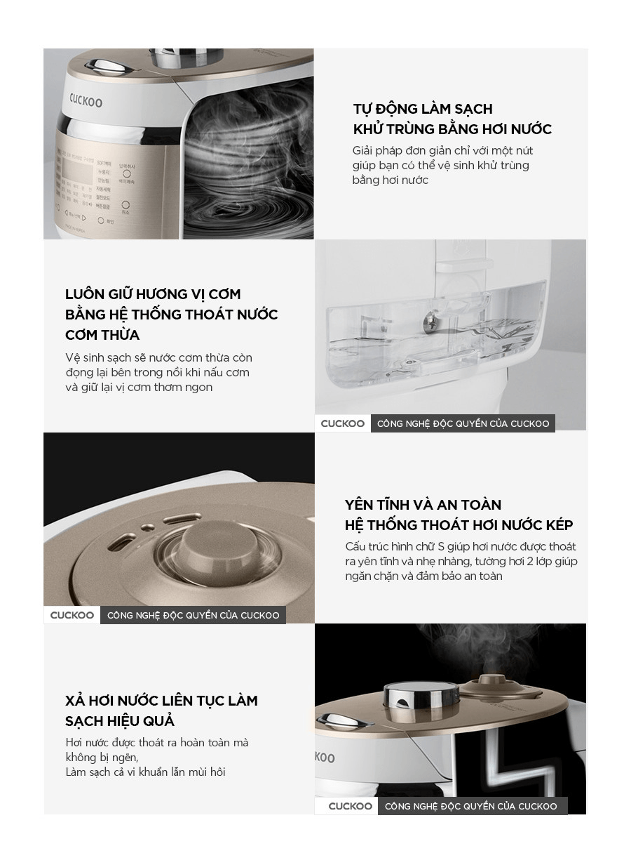 Chức năng này sẽ làm sạch bằng hơi nước và áp suất, khử sạch mùi hôi, vi khuẩn, cặn bẩn còn sót lại mà mắt thường không thể nhận biết cho nồi cơm điện sạch sẽ, bền tốt.