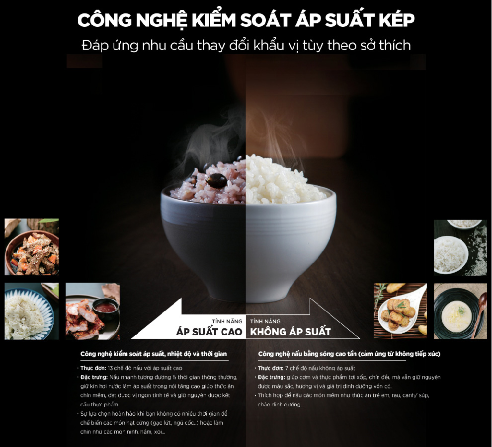 Chế độ có áp suất khi sử dụng áp suất nồi sẽ được tăng cao tối đa 2 atm, cho mức nhiệt trong lòng nồi lên đến 121°C, nấu cơm cho hạt cơm mềm, dẻo, có thể dùng để nấu các loại hạt, ngũ cốc, hầm áp suất cao, món luộc,... nấu chín nhanh trong 20-30 phút vào mỗi lần chế biến đồng thời cũng giúp giảm tiêu hao điện năng.