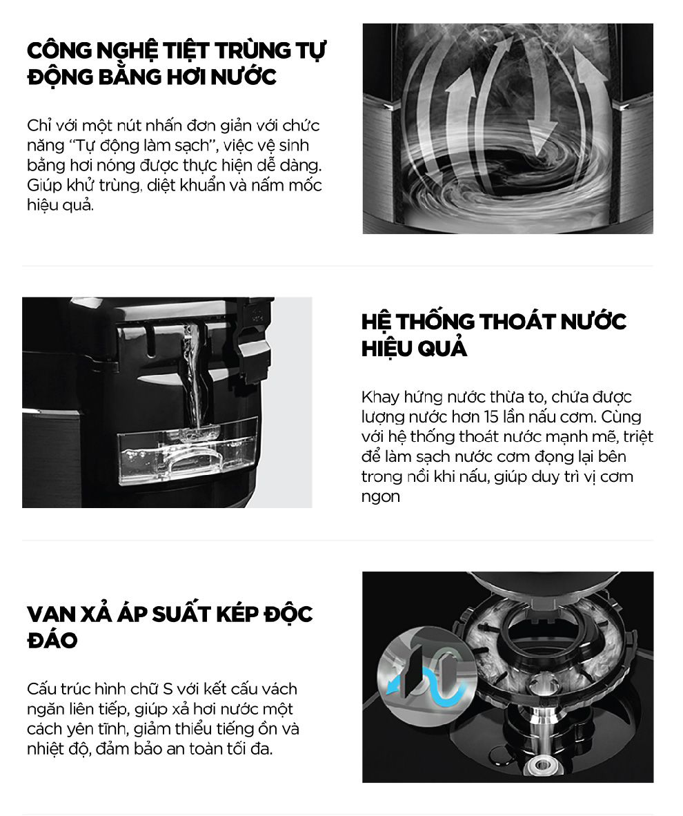 Chức năng này sẽ làm sạch bằng hơi nước và áp suất, khử sạch mùi hôi, vi khuẩn, cặn bẩn còn sót lại mà mắt thường không thể nhận biết cho nồi cơm điện sạch sẽ, bền tốt.
