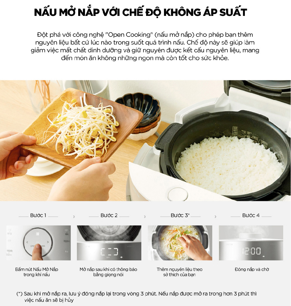 Tính năng Open Cooking sẽ giúp bạn có thể vừa nấu vừa thêm nguyên liệu vào nồi (áp dụng với các chế độ nấu không áp suất). Thông thường khi hoạt động, nắp nồi sẽ được khóa lại. Tuy nhiên, khi tính năng Open Cooking được kích hoạt, nồi cơm sẽ điều chỉnh nhiệt lượng đồng thời mở khóa nắp nồi.