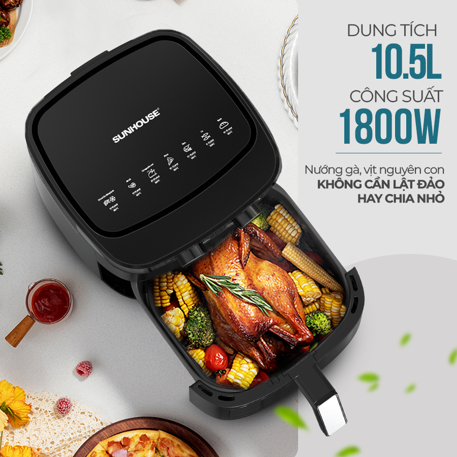 Nồi chiên không dầu Sunhouse SHD4038 sở hữu dung tích 10.5 lít thoải mái chiên nướng gà, vịt nguyên con mà không cần lật đảo trong quá trình chế biến.