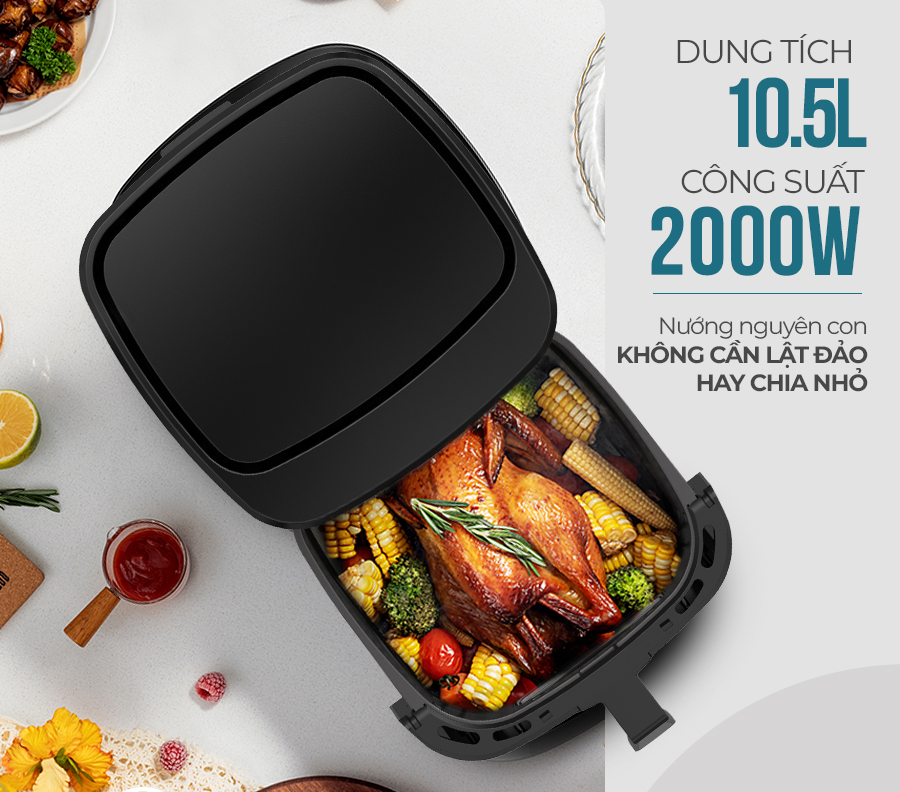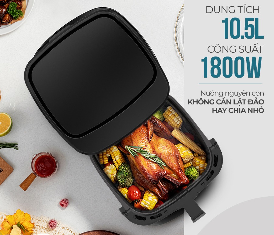 Nồi chiên không dầu Sunhouse Mama SHD4093 sở hữu dung tích cực khủng 10.5 lít, thoải mái nướng gà, vịt, sườn bò,...đáp ứng đủ khẩu phần ăn của cả gia đình.